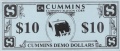 Testnote der Firma Cummins im Dollar-Format. Die Rückseite ist mit der Vorderseite identisch.