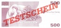 Testnote der Firma De la Rue Garny im Format der BBk III, 170 * 80 mm (500 DM), mit rotem diagonalem Aufdruck *TESTSCHEIN*, Vorder- und Rückseitendruck gleich, gehämmertes Papier.