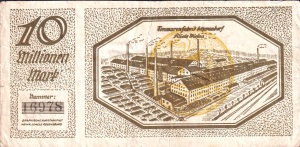 10 Mio; 11.9.23 mit Blätterrahmen, Wasserzeichen Dreieckrad