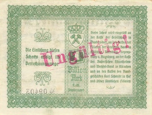 1 Bio; 2.11.23, Wasserzeichen Delta-Muster (P-Bay-1245n) 2 Bio; 2.11.23, Wasserzeichen Delta-Muster (P-Bay-1245n) 2 Bio; 2.11.23 wasserliniertes Papier, grün (P-Bay-1245q) 5 Bio; 2.11.23 Druck blau, Unterdruck hellrot, Wasserzeichen Delta-Muster (P-Bay-1245n) 5 Bio; 2.11.23 Druck schwarz, Unterdruck grün, Wasserzeichen G-S-Muster (P-Bay-1245o) 5 Bio; 2.11.23 Druck braunviolett Unterdruck karminrote Streifen, Wasserzeichen G-S-Muster (P-Bay-1245p) 5 Bio; 2.11.23 wasserliniertes Papier, grün (P-Bay-1245q) 5 Bio; 3.12.23 Datum handschriftlich (P-Bay-1245u)