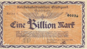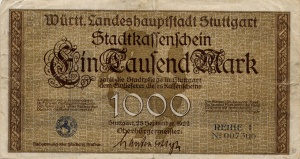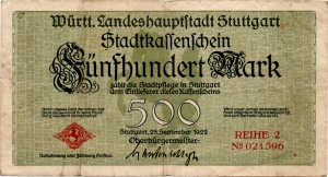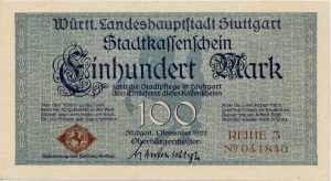 Die 100 und 1000 Mark Noten aus Stuttgart weisen Designverwandtschaften mit Reichspapiergeld auf, das zu dieser Zeit noch im Umlauf war. Möglicherweise hoffte man hier auf einen Wiedererkennungswert. Der 500er und der Schein zu 1 Mio. Mark kann als Fortsetzung der beiden Wertstufen gesehen werden.
