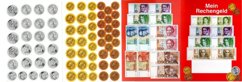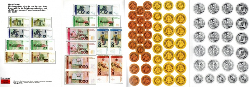 "Druckbogen": Der folgende Druckbogen wurde von einer deutschen Bank an Kinder ausgegeben. Er besteht aus vier DINA-4 Seiten. Die Scheine mussten ausgeschnitten werden, die Münzen waren vorgestanzt und mussten nur noch herausgedrückt werden. Ein ähnlicher Druckbogen existiert im Stile der BBk I.