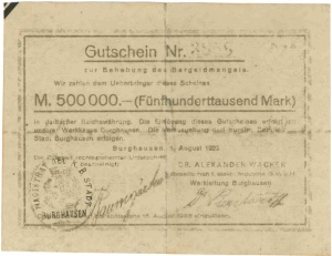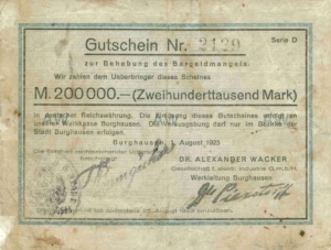 Die städtischen Elektrizitätswerke Burghausen verwendeten für Ihre auf Goldpfennige lautenden Scheine die in großen Mengen vorhandenen und nun wertlosen Reichsbankscheine aus dem Jahr 1922.