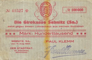 | + | <td>[[Bild:SebnitzKe4734a100TRs.jpg|thumb|none|300px|'''Sebnitz: 100.000 Mark, Rückseite''']]</td> | ||