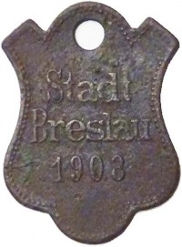 | + | [[File:Hundemarke-1903v.jpg||thumb|none|200px|'''Stadt Breslau - Hundesteuermarke - 1903 - Avers''']]</td> | ||