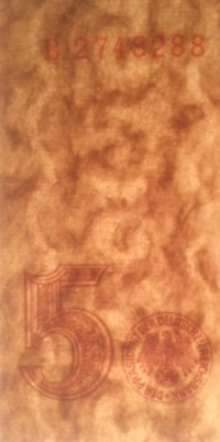 Quelle: Bekanntmachung des Präsidenten der Deutschen Reichsbank vom 1.8.1942 betreffend die Ausgabe neure Reichsbanknoten zu 5 Reichsmark mit dem Datum vom 1. August 1942.