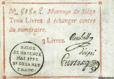 | − | <center>[[Datei: | + | <center>[[Datei:Mainz-PS-1477bo.jpg|thumb|none|370px|'''[[Deutschland]]: Mainz PS-1477b, 3 Livres 1793 <br> Direkt zum Artikel: [[Mainz: Belagerung 1793]]''']]</center> |