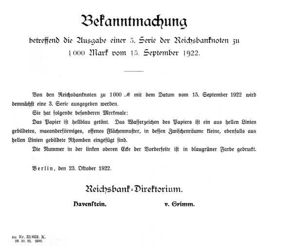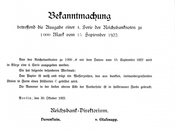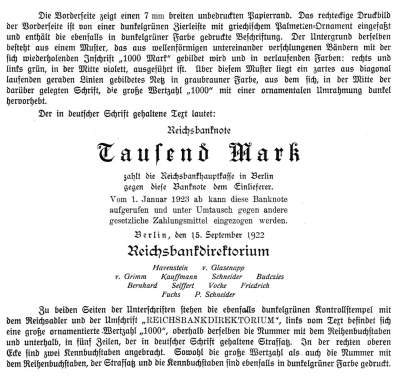 Reichsbanknote zu 1000 Mark V. Ausgabe vom 15. September 1922
