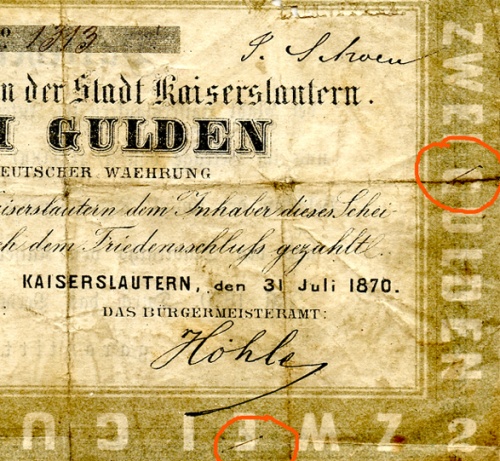 Geheimzeichen auf den Darlehen-Scheinen der Stadt Kaiserslautern von 1870